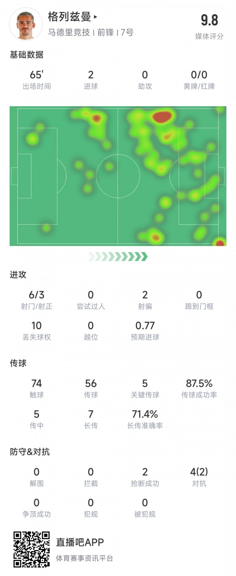 格列兹曼本场数据:6脚射门打进2球,送出5记关键传球
