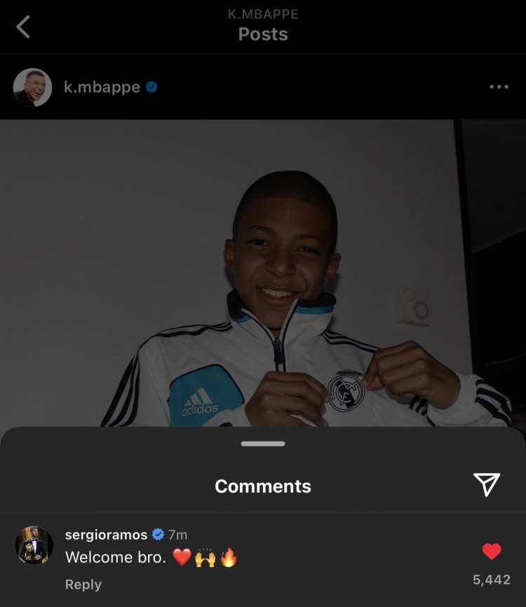 姆巴佩社媒发文庆祝加盟皇马,拉莫斯留言:欢迎你