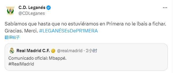 皇马官宣姆巴佩,升班马莱加内斯调侃:等我们升级了你们才签