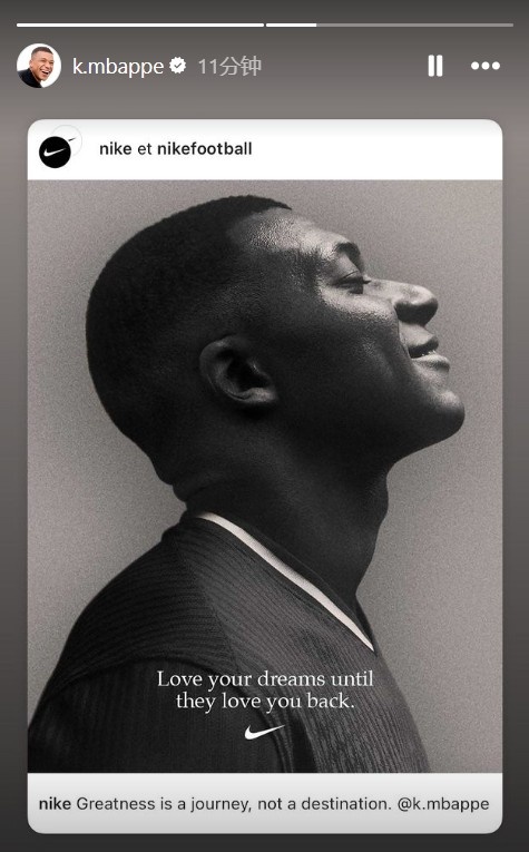 姆巴佩先用社媒转发了皇马的官宣新闻,随后也转发了耐克准备的“热爱你的梦想直到他也爱你”海报。