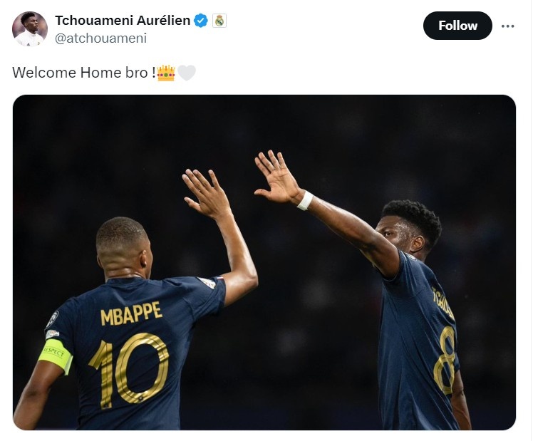 琼阿梅尼欢迎姆巴佩加盟皇马:欢迎回家兄弟!