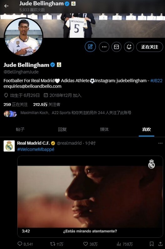 3.6亿兄弟贝林厄姆点赞姆巴佩官宣新闻