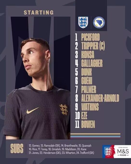 友谊赛英格兰vs波黑首发:帕尔默、加拉格尔、阿诺德出战
