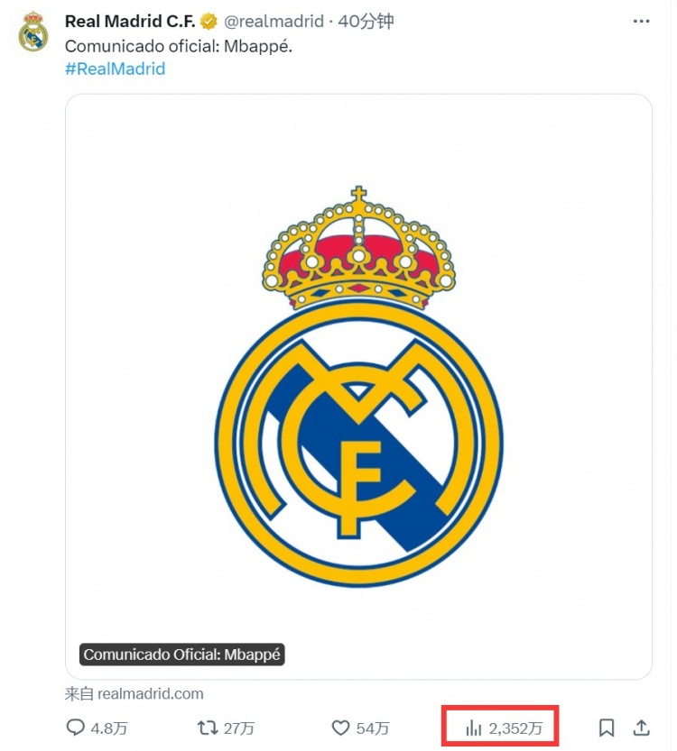 这就是姆巴佩!官宣推文不到40分钟已2352万浏览 远超15冠