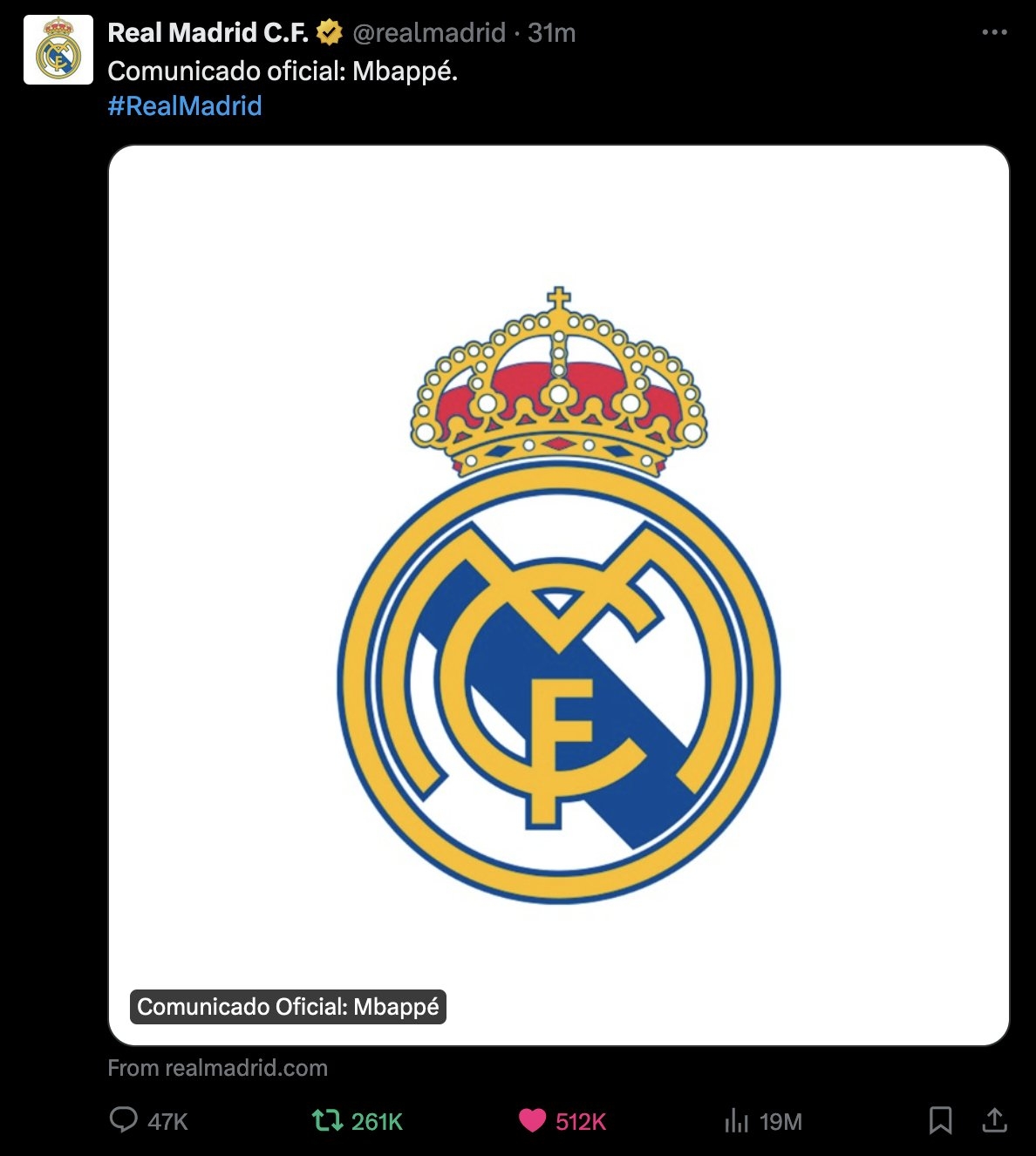 万众瞩目!皇马官宣姆巴佩的动态30分钟已经50万点赞