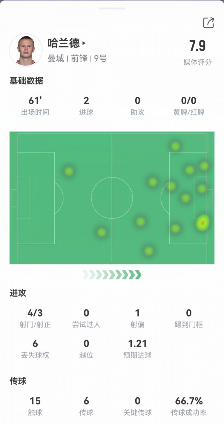 哈兰德本场数据:出场61分钟仅15次触球即双响,获评7.9分