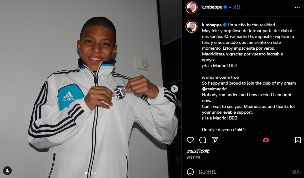 姆巴佩:“梦想成真,很高兴和自豪加入我梦想的俱乐部——皇马。没人能理解我此刻有多兴奋。等不及见你们了,马德里主义者们,谢谢你们的支持。Hala Madrid!”