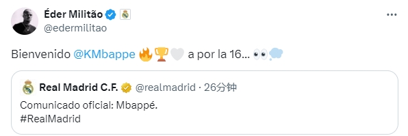 06月04日讯 皇马正式官宣姆巴佩加盟,米利唐发文欢迎。米利唐:“欢迎姆巴佩