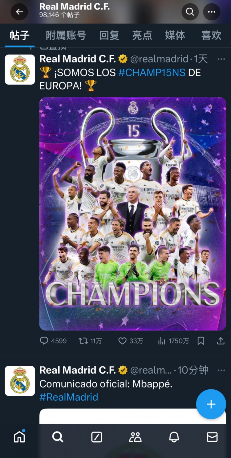 团队>个人!官宣姆巴佩后,皇马官推置顶位仍为第15冠!