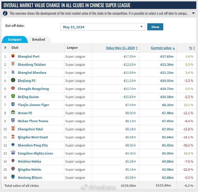 6月5日讯 德转更新了最新的中超球队身价榜,其中上海海港1783万欧居首,山东泰山队1330万欧次席,上海申花、浙江、成都蓉城分列3到5位。