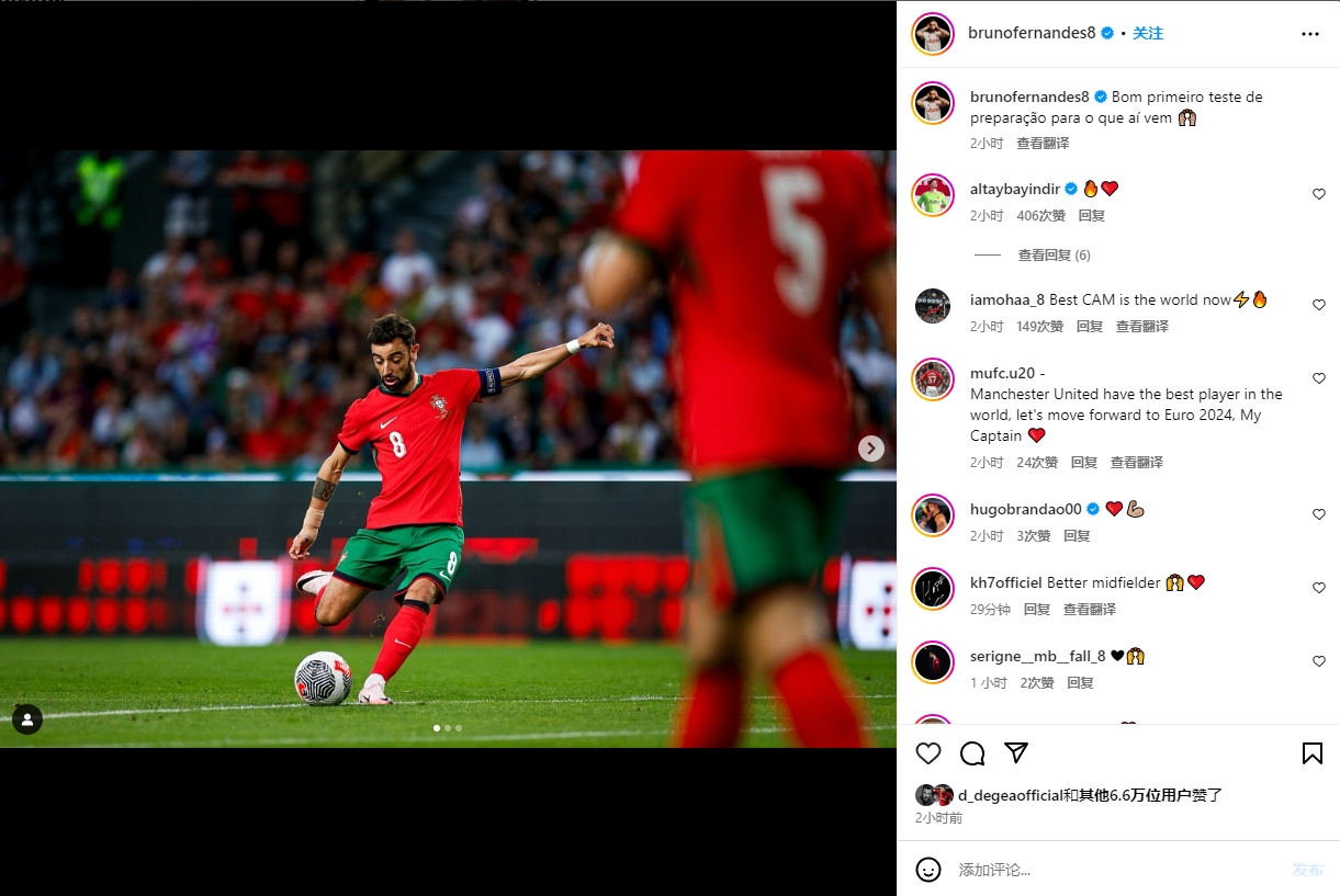赛后B费在社交媒体上晒出自己的比赛照片,并写道:“很好的第一场测试,为即将到来的比赛(欧洲杯)做好准备。”