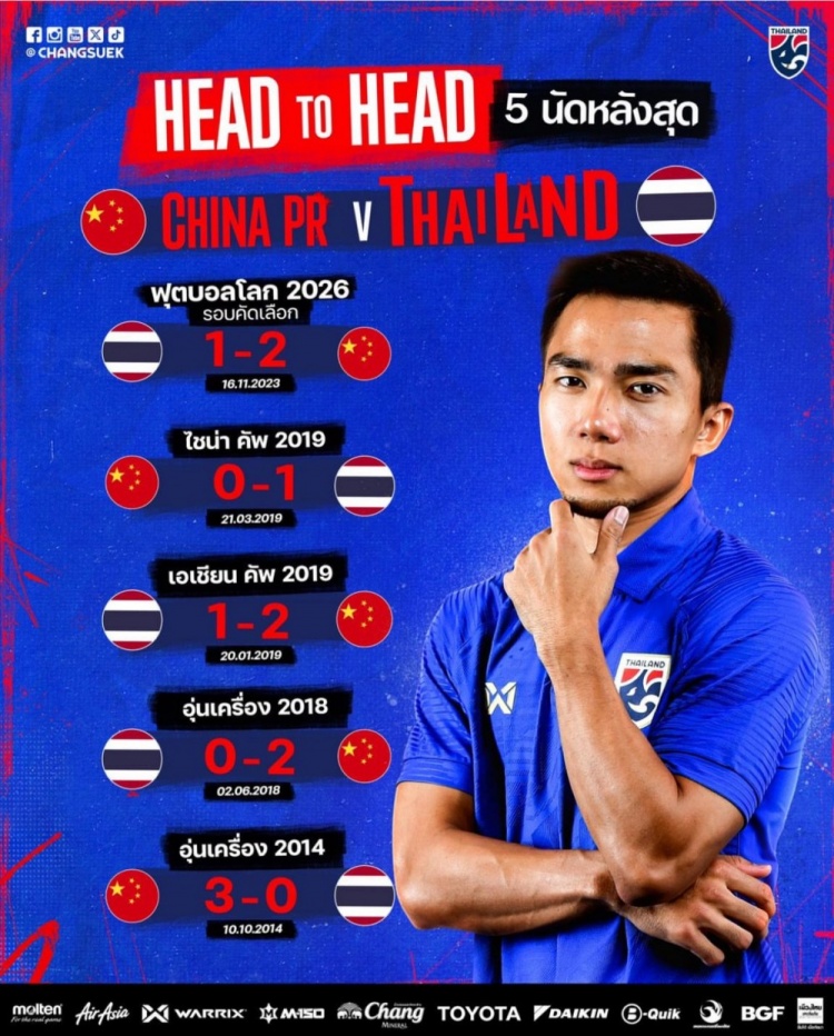 泰国队官方晒出中泰近5次交手成绩,中国队4胜1负占据优势