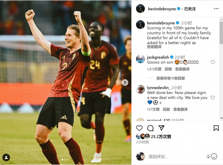 德布劳内社媒:国家队百场里程碑破门,没有比这更美妙的夜晚了