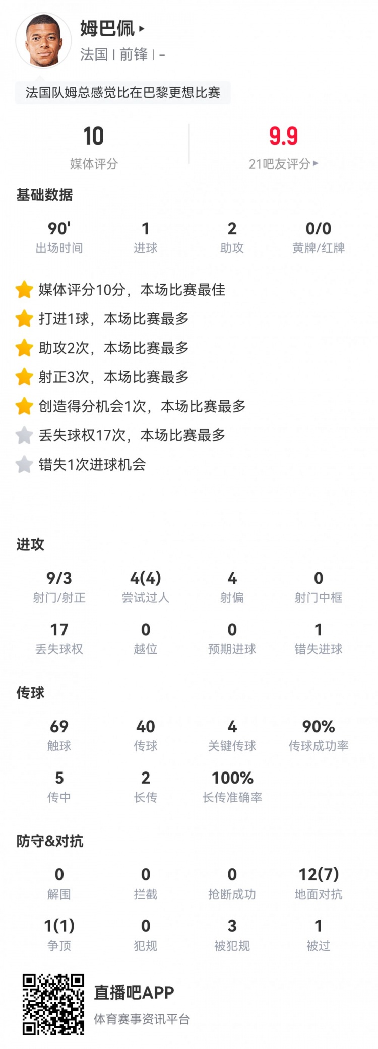 满分表现!姆巴佩数据:9射3正,1射2传,4次关键传球,10分满分