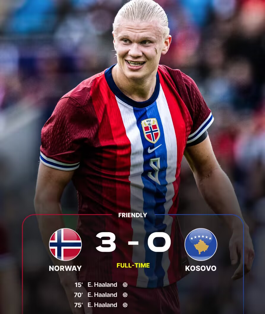 06月06日讯 友谊赛挪威对阵科索沃,哈兰德上演帽子戏法,帮助挪威3-0战胜科索沃。