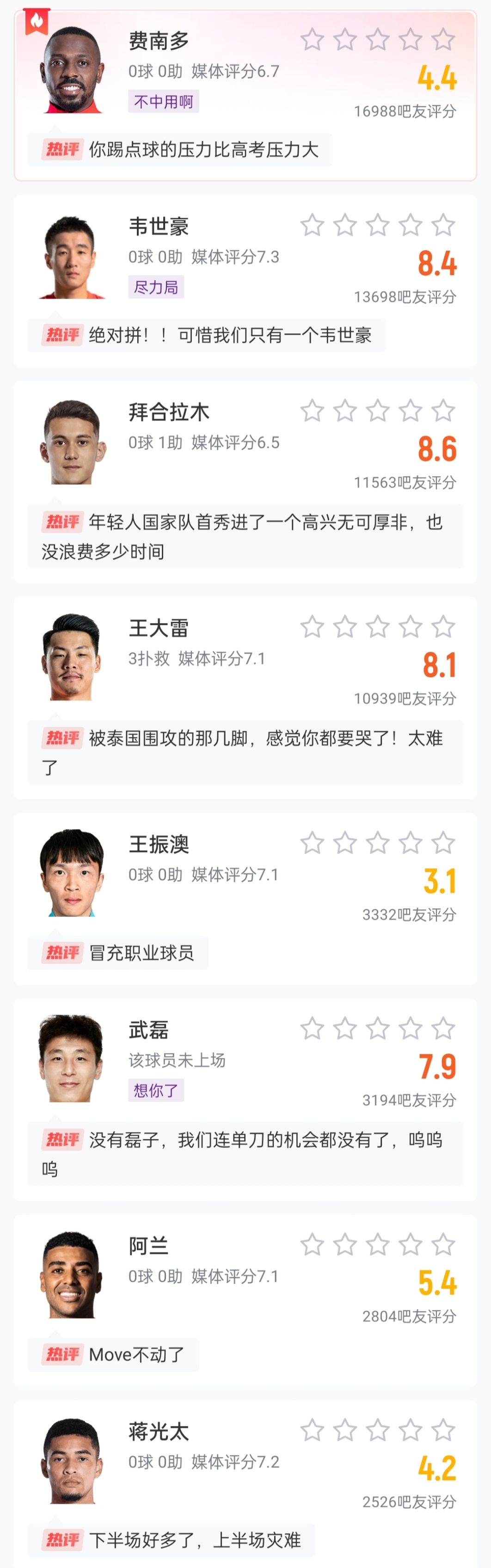 世预赛,国足主场1-1战平泰国。吧友们赛后为国足打分,在上场的球员中,共有11人的分数不及格。其中高天意2.5分最低。罚丢点球的费南多拿到4.4分。
