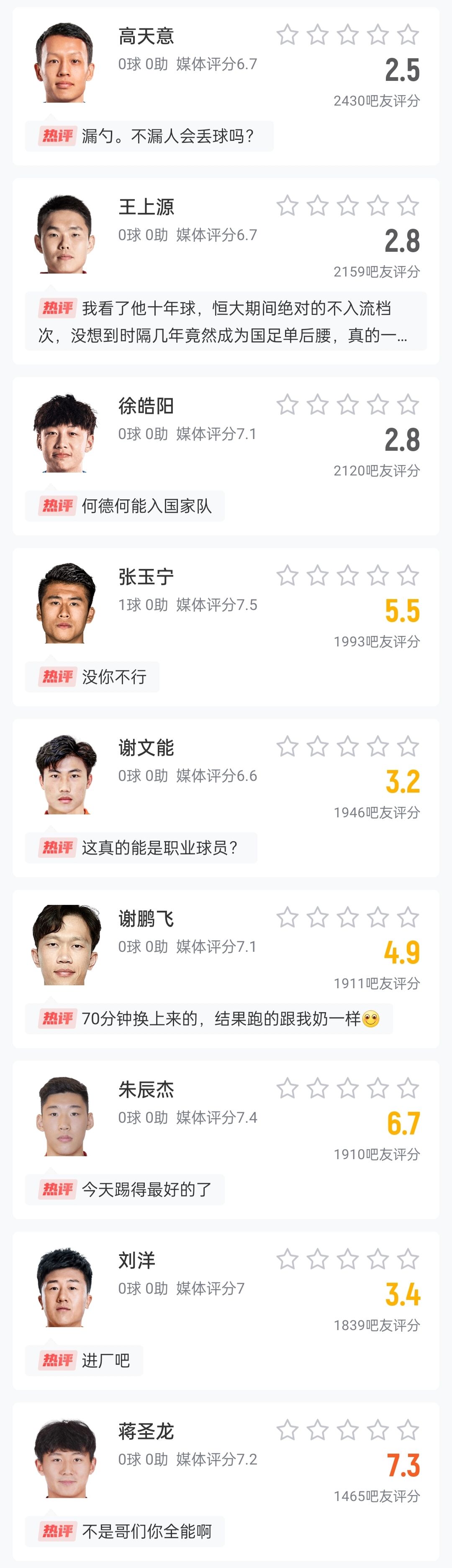 吧友国足评分:11人不及格,3人超8分!高天意2.5最低,费南多4.4
