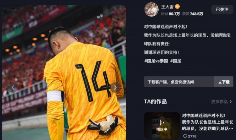赛后,王大雷在社媒发文:“对中国球迷说声对不起,我作为队长也是场上最年长的球员,没能帮助到球队我有责任!谢谢球迷们的支持!”