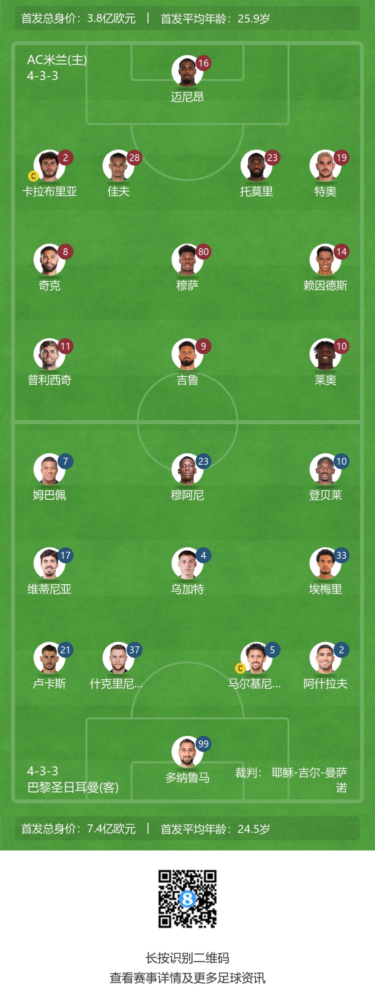 AC米兰vs巴黎首发:姆巴佩PK莱奥,吉鲁、普利西奇、穆阿尼先发