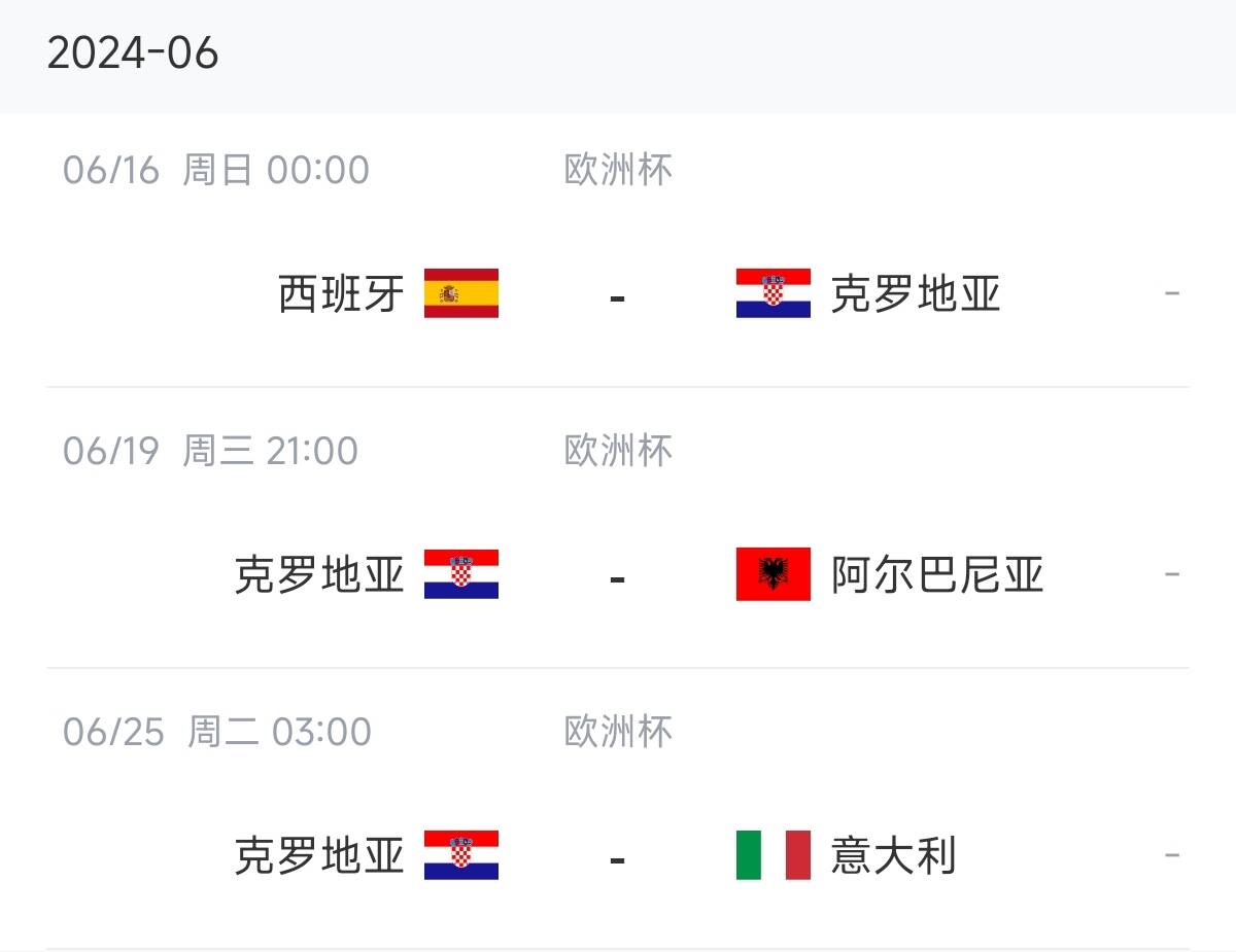 欧洲杯小组赛,克罗地亚将在6月16日、19日、25日先后对阵西班牙、阿尔巴尼亚和意大利。