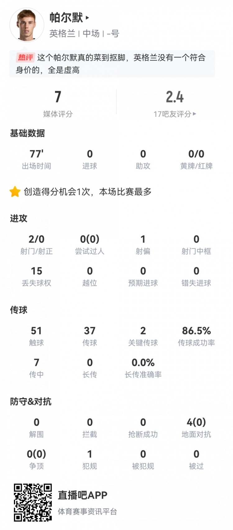6月8日讯 友谊赛,英格兰主场0-1不敌冰岛。帕尔默首发出战77分钟被换下,球员全场重点数据如下↓