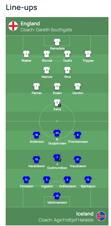 英格兰首发:1-拉姆斯代尔、2-凯尔-沃克、5-斯通斯、6-格伊、3-特里皮尔、4-赖斯、8-梅努、7-帕尔默、10-福登、11-戈登、9-凯恩