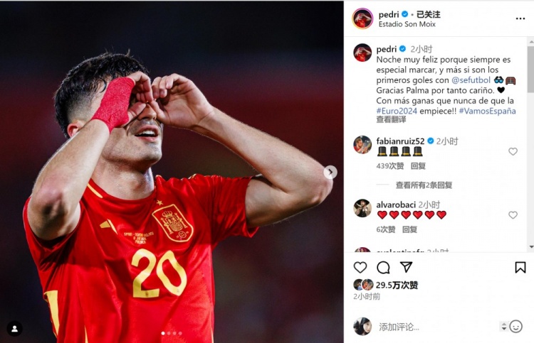 赛后佩德里在社交媒体上晒出自己庆祝进球的照片,并写道:“非常开心的夜晚,因为进球总是很特别,考虑到这是我在西班牙队的处子球,就更加特别了。感谢帕尔马(西班牙城市)球迷对我们的爱,比以往任何时候都更期待欧洲杯开始!”