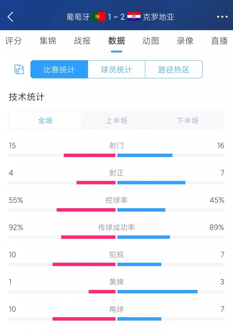 葡萄牙1-2克罗地亚全场数据:控球率55%-45% 射门15-16