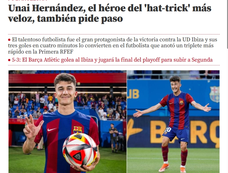6月10日讯 在西班牙皇家足协甲级联赛(第三级别联赛)的一场焦点战中,巴萨预备队和伊维萨队上演了一场惊心动魄的进球大战。最终,巴萨预备队5-3击败对手,获得了参加西乙升级附加赛资格。19岁的乌奈-埃尔南德斯在4分钟内上演帽子戏法。