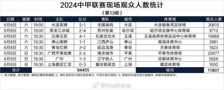 2024中甲联赛现场观众人数统计(第13轮) ​​​
