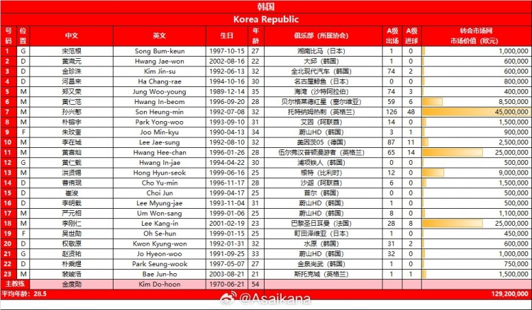 另外,韩国队23人的平均年龄为28.5岁。