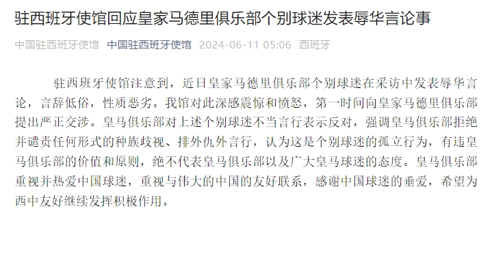 驻西班牙使馆注意到,近日皇家马德里俱乐部个别球迷在采访中发表辱华言论,言辞低俗,性质恶劣。我馆对此深感震惊和愤怒,第一时间向皇家马德里俱乐部提出严正交涉。皇马俱乐部对上述个别球迷不当言行表示反对,强调皇马俱乐部拒绝并谴责任何形式的种族歧视、排外仇外言行,认为这是个别球迷的孤立行为,有违皇马俱乐部的价值和原则,绝不代表皇马俱乐部以及广大皇马球迷的态度。皇马俱乐部重视并热爱中国球迷,重视与伟大的中国的友好联系,感谢中国球迷的垂爱,希望为西中友好继续发挥积极作用。
