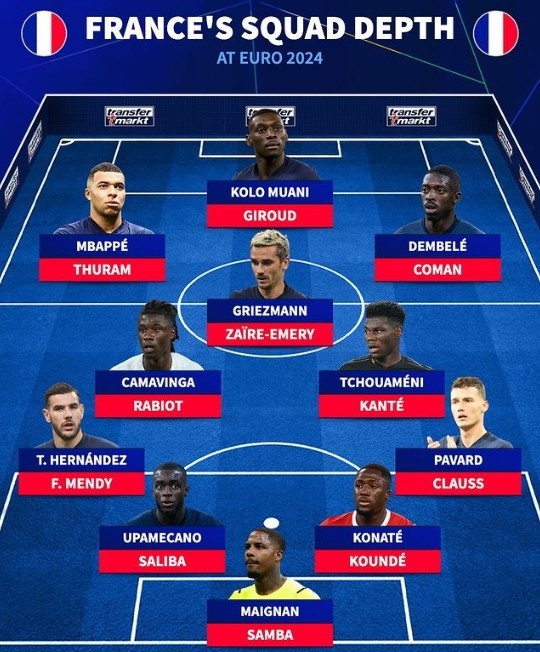 6月11日讯 欧洲杯开战在即,《转会市场》也列出了本届欧洲杯法国队的阵容深度能列出的两套首发:
