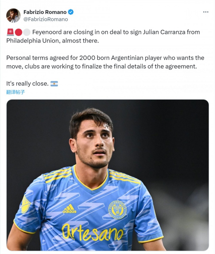 罗马诺指出,费耶诺德对费城联合24岁阿根廷前锋卡兰萨感兴趣,他们已经与球员就个人条款达成协议,球员渴望加盟,目前费耶诺德和费城联合正在敲定转会协议的最终细节,这笔交易非常接近成行。