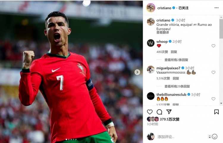 梅开二度!C罗社媒:漂亮的胜利,向欧洲杯迈进!