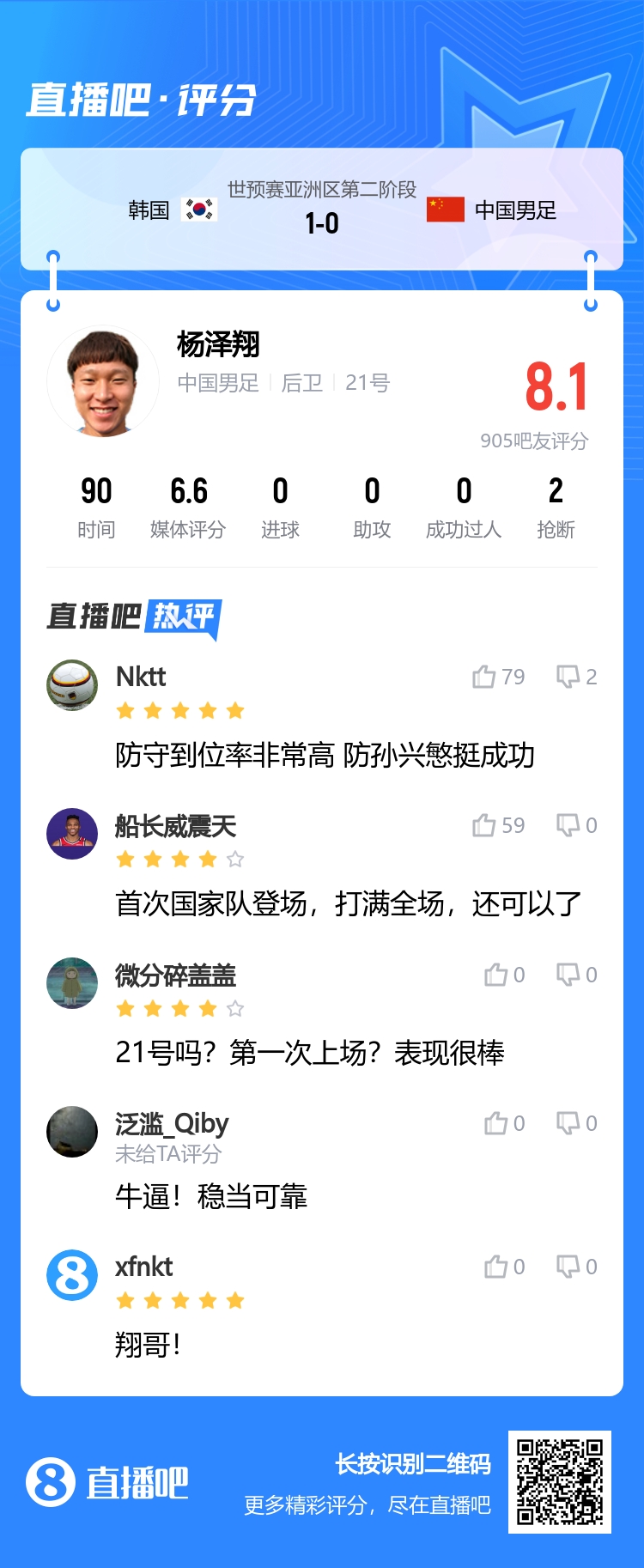 国足首秀就踢韩国!吧友给杨泽翔评分8.1:防孙兴慜挺成功