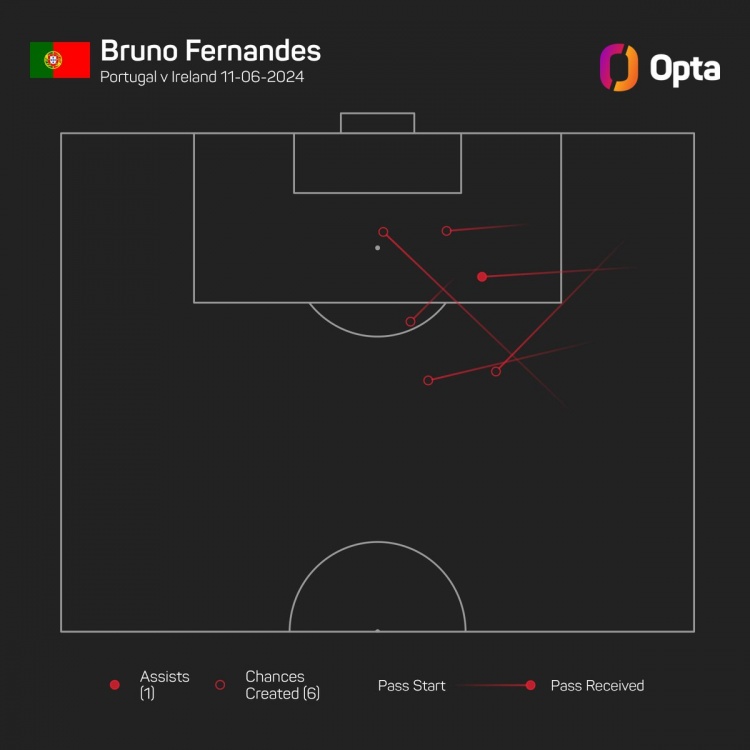 B费对阵爱尔兰创造6次进球机会全场最多,至少比其他球员多4次
