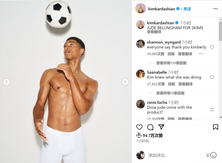 金-卡戴珊在社交媒体上晒出贝林厄姆代言品牌的宣传照片,并写道:“贝林厄姆为SKIMS代言。”此前内马尔也曾推广过该品牌。