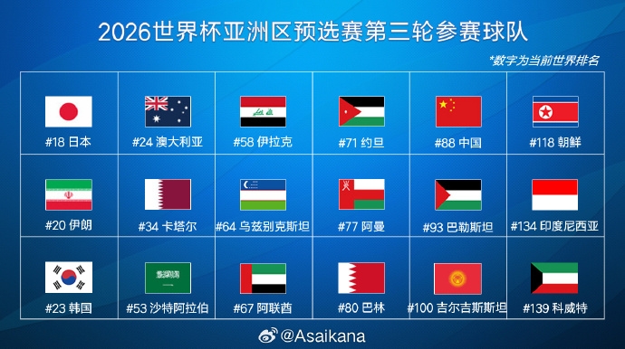 世预赛亚洲区第三阶段(十八强赛)所有参赛球队出炉:日本、伊朗、韩国、澳大利亚、卡塔尔、沙特阿拉伯、伊拉克、乌兹别克斯坦、阿联酋、约旦、阿曼、巴林、中国、巴勒斯坦、吉尔吉斯斯坦、朝鲜、印度尼西亚、科威特。