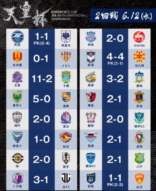 6月13日讯 2024年第104届天皇杯第二轮全部战罢,经过第一轮淘汰赛后,共有64支球队参加第二轮淘汰赛,而本轮比赛出现了不少冷门。J联赛领头羊町田泽维亚与筑波