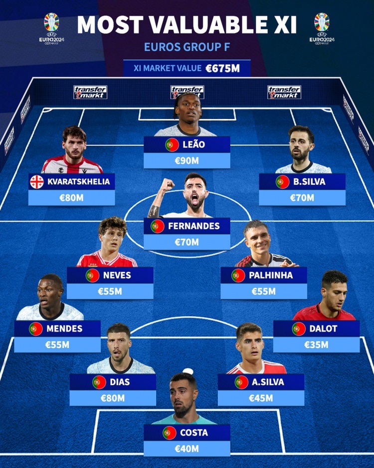 6月13日讯 葡萄牙、格鲁吉亚、土耳其、捷克处于欧洲杯F组,德国转会市场列出了本组身价最高阵容,莱奥、克瓦拉茨赫利亚、B费在列,葡萄牙10名球员入选。欧洲杯F