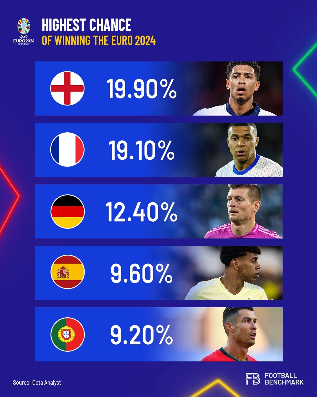 6月13日讯 2024欧洲杯即将开幕,足球金融媒体Football Benchmark预测了最新的夺冠概率。