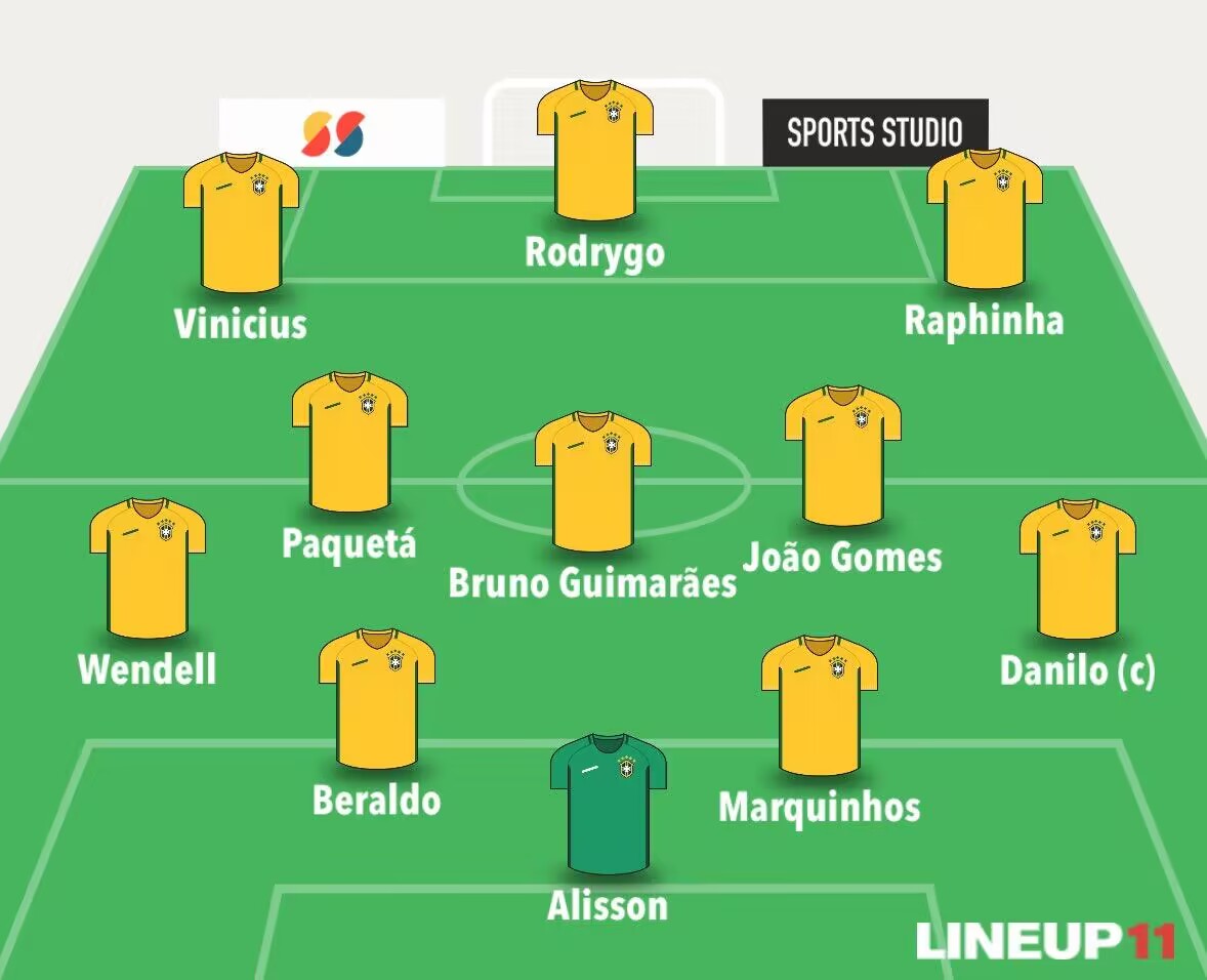 巴西首发:1-阿利森、4-马尔基尼奥斯、17-贝拉尔多、6-温德尔、2-达尼洛、5-吉马良斯、15-若昂-戈麦斯、8-帕奎塔、11-拉菲尼亚、10-罗德里戈、7-维尼修斯