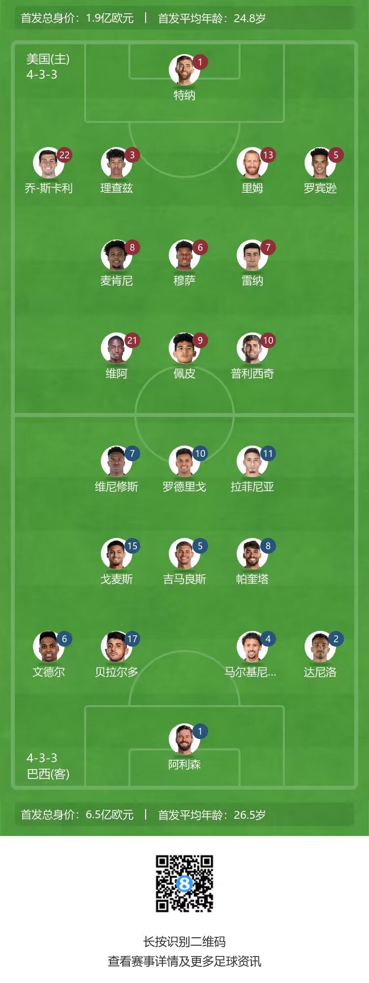 友谊赛-巴西vs美国首发:维尼修斯、罗德里戈先发,普利西奇出战