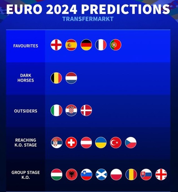 6月13日讯 欧洲杯开战在即,《转会市场》也预测了本届赛事的实力分档情况:夺冠热门:英格兰、西班牙、德国、法国、葡萄牙黑马:比利时、荷兰希望渺茫:意大利、克