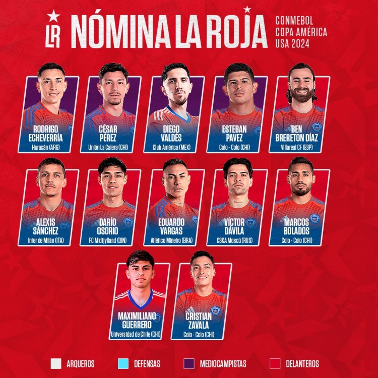 前锋:迪亚斯(比利亚雷亚尔)、桑切斯(国米)、奥索里奥(中日德兰)、巴尔加斯(米内罗竞技)、达维拉(莫斯科中央陆军)、博拉多斯(科洛科洛)、格雷罗(智利大学)、萨瓦拉(科洛科洛)