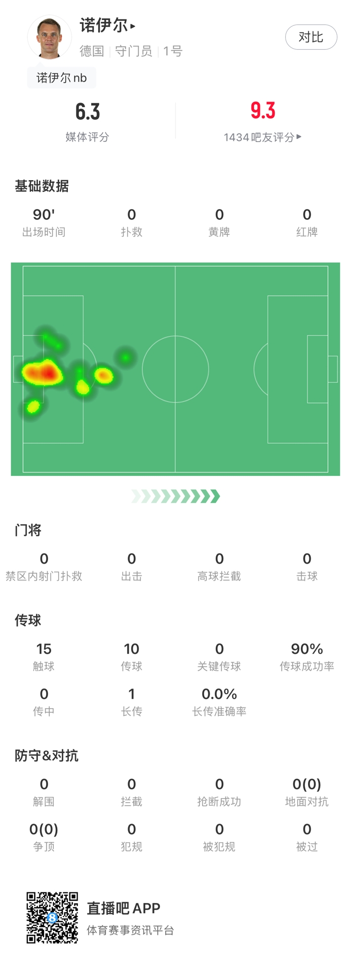 诺伊尔全场0扑救、0出击、0高球拦截、0击球,触球15次,获评6.3分队内最低。不过,吕迪格最后阶段乌龙球,诺伊尔无缘零封。