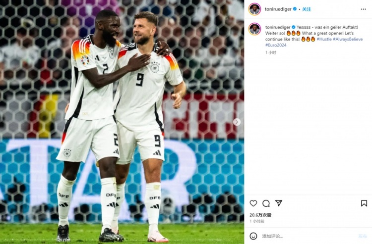 6月15日讯 欧洲杯揭幕战,德国5-1大胜苏格兰取得开门红,吕迪格打进一粒乌龙。赛后,吕迪格更新社媒:“Yesssss!多么棒的揭幕战!让我们继续努力吧!