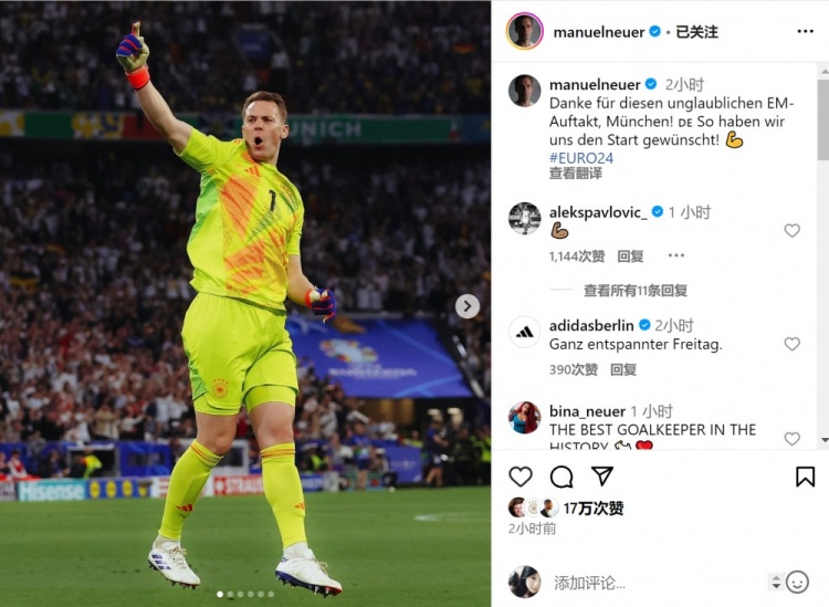 赛后诺伊尔在社交媒体上晒出自己庆祝的照片,并写道:“感谢你们为欧洲杯开了个好头,慕尼黑!这就是我们想要的开局!”