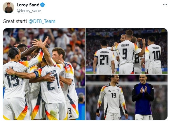 萨内发推庆祝德国欧洲杯开门红:好的开始!